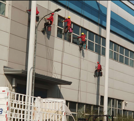2、吊籃方式:在樓頂架設(shè)吊籃將工人運(yùn)送到指定位置進(jìn)行施工操作。此施工方式清洗效率較低,成本較高。